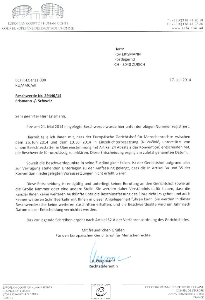 Vom EGMR wurde am 17. Juli 2015 ein einziges schriftliches Dokument ausgestellt, nachdem dieselben 281 Seiten Dokumente dem EGMR, kurz vorher, ein zweites Mal zugestellt worden waren. Telefax mit Bestätigungsanfragen, ob die erste Zustellung mit den 281 Seiten Beschwerdedokumenten vollständig eingetroffen sind führten zu keiner Antwort. Schriftliche Korrespondenz, ausser der Zulassungsverweigerung, wurde vom Europäischen Gerichtshof keine geführt und die zahlreichen Telefax blieben unbeantwortet.