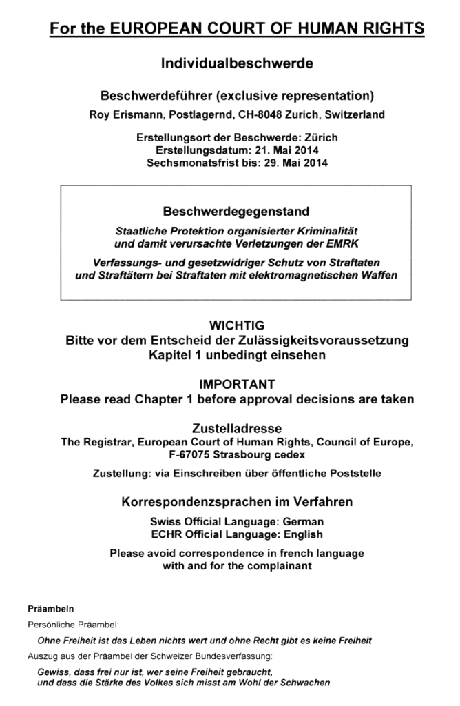 Alle Anstrengungen die angestrebte innerstaatliche Lösung herbeizuführen verblieben bis Mai 2014 ohne Ergebnis. Meine persönliche Betroffenheit geltend machend habe ich beim Europäischen Gerichtshof für Menschenrechte am 21. Mai 2014 eine ausführliche Beschwerde eingereicht. Der Entscheid für die Prüfung einer Zulässigkeitsvoraussetzung wurde nach der Einreichung auf 4-6 Wochen veranschlagt.
